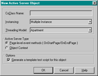 De CoClass Name is de interne naam van ons COM Object. We kunnen hier invullen wat we willen, zoals bijvoorbeeld "DOC". De Instancing en Threading Model velden hebben over het algemeen al de juiste default waarden. Later kunnen we hier van afwijken (door Single Instance te kiezen in plaats van Multiple Instance), maar voorlopig laat ik de opties gewoon zo staan. De Active Server Type opties zijn belangrijk. Afhankelijk van de versie van je web server (en daarmee de versie van ASP die ondersteund wordt) moet je hier voor de Page-level event methods (zoals OnStartPage en OnEndPage) kiezen, of voor de nieuwere ASP 3.0 Object Context. De meest voor de hand liggende keuze is de eerste - default - keuze voor ASP 2.0 die door IIS 3 en IIS4 ondersteund wordt. Alleen als je zeker weet dat je ASP 3.0 kan gebruiken - dus met IIS 5 of IIS 4 en MTS - moet je voor de Object Context kiezen. Ik heb nog geen praktijkervaring met deze laatste optie, maar heb begrepen dat het niet zo heel veel anders werkt. We komen hier op een later moment zeker nog op terug; voorlopig gebruiken we de meer toegankelijke Page-level event methods. Tot slot is de optie om een template script (lees: skelet .asp pagina) te laten genereren wel handig, zeker voor wie voor het eerst een ASP pagina en object aan het maken is.