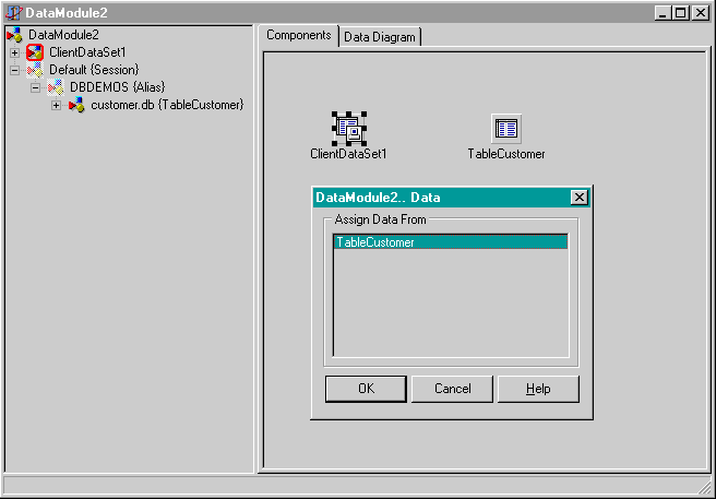 Door vervolgens met de rechtermuisknop op de ClientDataSet te klikken en te kiezen voor de menu-optie "Assign Local Data" krijgen we een lijst met alle datasets (tabellen of queries) die beschikbaar zijn op dit form of data module.