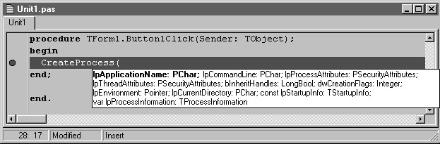 Deze feature werkt zelfs op de routines die we zelf geschreven hebben, doordat Delphi 3 op de achtergrond voortdurend alle geschreven code aan het parsen is en een lijst bijhoudt van alle routines met hun parameters (en types). Een mooi voorbeeld is de Win32 API CreateProcess, waarbij ik niet denk dat ik ooit de lijst met parameters (en hun types) zou kunnen onthouden. Maar nu krijg ik deze lijst gratis voorgetoverd nadat ik de open-haak heb ingetikt. Erg handig! Om de parameterlijst direkt zichtbaar te krijgen moeten we Control+Shift+Space intoetsen.