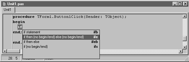 Zoals de naam doet vermoeden gaat het hier om stukken voorgebakken code (zoals een if-statement in al zijn vormen, maar ook het skelet van een procedure, function of case-statement) wat we kunnen oproepen met Control+J.