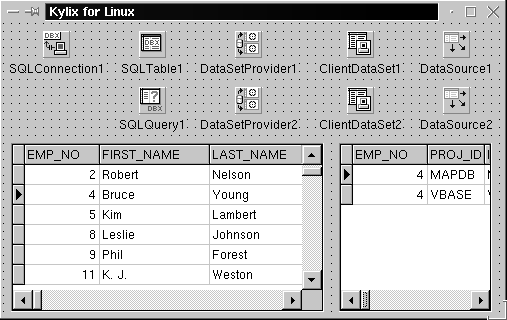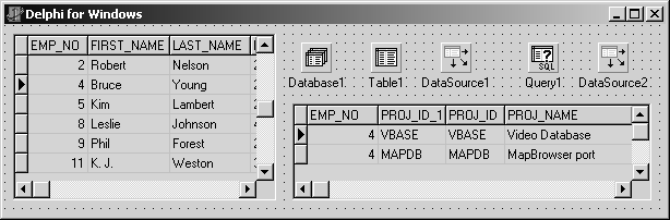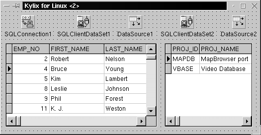SELECT * FROM PROJECT, EMPLOYEE_PROJECT WHERE (PROJECT.PROJ_ID = EMPLOYEE_PROJECT.PROJ_ID) ORDER BY EMP_NOOk nu zal de TSQLClientDataSet de volledige lijst van employees met hun projecten bevatten, gesorteerd op EMP_NO. Nu moeten we nog zorgen dat we alleen de projecten van de huidige employee zien, en dat gaat weer door als MasterSource de DataSource van de eerste TSQLClientDataSet te nemen, en als MasterKey de EMP_NO velden te koppelen. Het resultaat is gelijk aan wat we zojuist onder Linux zagen, alleen hebben we er nu weer maar vijf data access componenten voor nodig (in plaats van negen zonet):