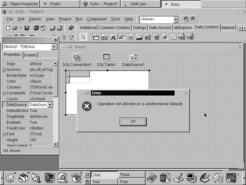 En de TSQLTable component hoeft niet eens open te zijn om al een foutmelding te (laten) genereren zodra we de TDBGrid verbinden met de TDataSource component: