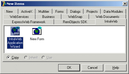Doe File | New - Other, ga naar de IntraWeb tab van de Object Repository, en dubbelklik op de New Form icon voor de IntraWeb New Form dialoog: