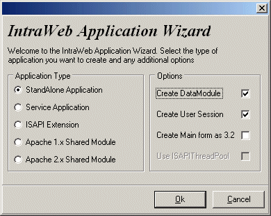 Dubbelklik op de New IntraWeb Application icon om de nieuwe IntraWeb Application Wizard te krijgen. De default keuze staat op een StandAlone Application met User Session. Da's prima, maar ik wil er ook een Data Module bij gebruiken, dus zet die optie ook aan: