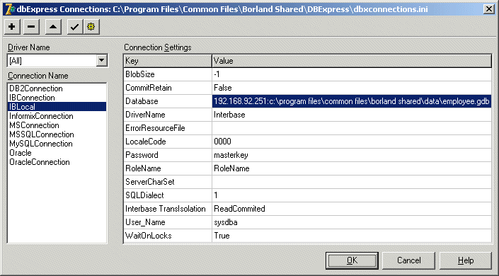 Merk op dat ik de Database niet alleen naar de lokatie van de employee.gdb database laat wijzen, maar ook als prefix het IP-adres (of de DNS naam) van de server zelf opgeef.