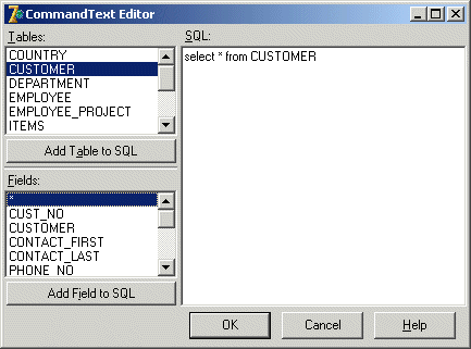 Dubbelklik nu op de CommandText property om de dbExpress Query CommandText Editor te starten.