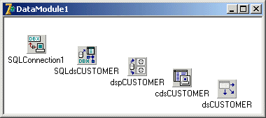 Laat de DataSet property van de dspCUSTOMER TDataSetProvider component wijzen naar de SQLdsCUSTOMER TSQLDataSet component, de ProviderName property van de cdsCUSTOMER TClientDataSet component wijzen naar de dspCUSTOMER TDataSetProvider component, en tot slot de DataSet property van de dsCUSTOMER TDataSource component wijzen naar de cdsCUSTOMER TClientDataSet component.