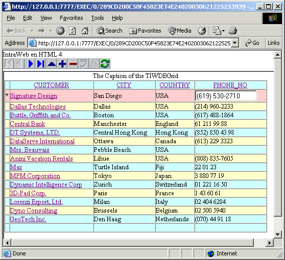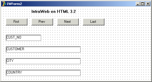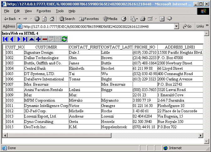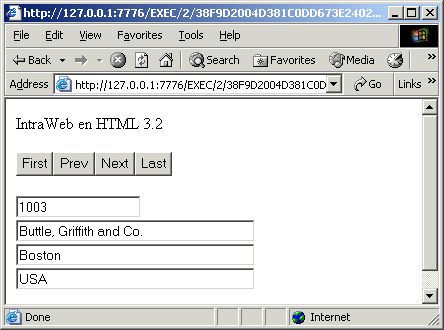 Door op de linker knop te drukken wordt de default browser gebruikt (dat is weer Internet Explorer), en deze keer zien we de "3.2" versie van de IntraWeb toepassing. Door op de First, Prev, Next en Last knoppen te drukken kunnen we navigeren door de customer tabel: