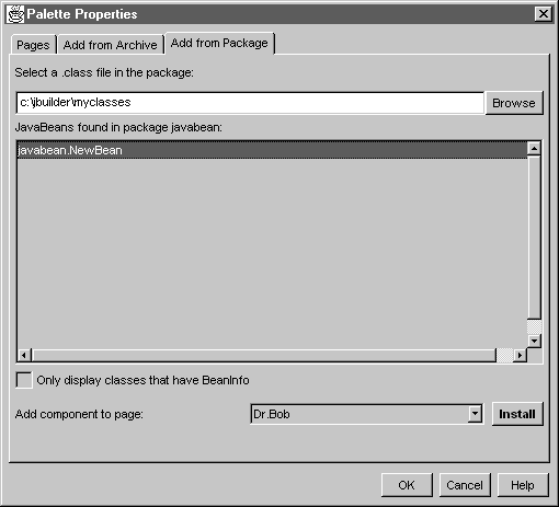 Om de nieuwe Java Bean uiteindelijk ook nog op JBuilder's Component Palette te krijgen, hoeven we nu alleen nog maar Tools | Configure Palette | Add from Package te doen.