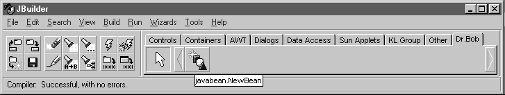 En als we op de OK knop hebben gedrukt kunnen we onze nieuwe Java Bean inderdaad terugvinden op het Component Palette in de Dr.Bob tab. Klaar voor hergebruik in JBuilder. De Java Bean kan overigens ook in andere omgevingen gebruikt worden, zolang we maar 100% puur java blijven schrijven (en niet zoals Visual J++ soms afwijken van de standard).