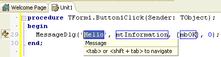 Het | teken dat tussen de quotes van de MessageDlg staat geeft aan waar de cursor komt nadat de live is geactiveerd.