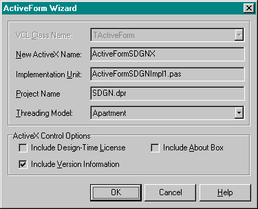 Start Delphi 4, kies de File | New menu optie, selecteer "ActiveForm" uit de "ActiveX" tab van de Object Repository, en start een ActiveForm project genaamd SDGN: