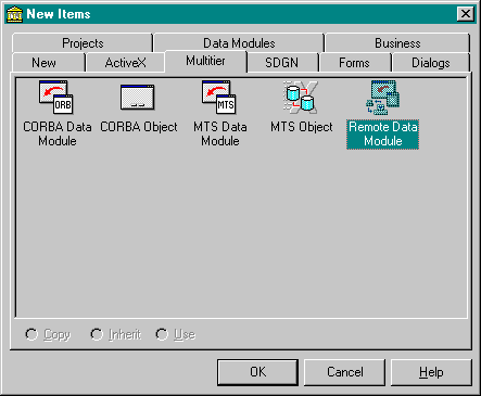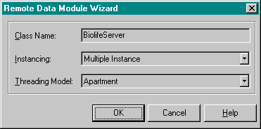 Merk op dat we kunnen kiezen voor een CORBA Data Module (als we CORBA willen gebruiken), een MTS Data Module (voor Microsoft Transaction Server) of een "standard" Remote Data Module (voor MIDAS, en uitbreidbaar met CORBA, zoals we zullen zien). We kiezen hier dus voor de normale Remote Data Module (met als naam BiolifeServer), en krijgen een nieuwe datamodule die zich in niets lijkt te onderscheiden van een gewone data module. Totdat we een kijkje nemen in de source code, en zien dat er behalve de TDataModule class, ook van een interface class afgeleid wordt.