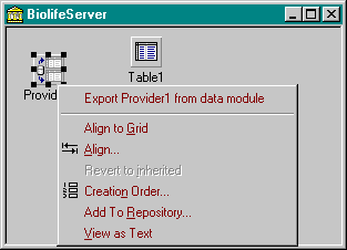 Op de Remote Data Module kunnen we nu een TTable component plaatsen die we laten wijzen naar de BIOLIFE table van DBDEMOS (net als in de ActiveForm van vorig voorbeeld). Deze keer willen we de TTable echter exporteren naar "client" toepassingen, en hiervoor hebben we nog een Provider component nodig uit de Midas tab van Delphi 4. Zet de TProvider component naast de TTable component, en geef de DataSet property de waarde Table1. Nu moeten we deze Provider nog fysiek "exporteren" naar de buitenwereld, en dat doen we door met de rechtermuisknop op de Provider component te klikken, en de optie "Export Provider1 from data module" te kiezen.
