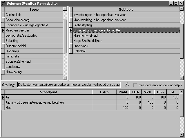 Met behulp van de Borland Database Desktop zijn deze drie tabellen - in Paradox formaat - in luttele minuten gemaakt. Vervolgens heb ik in Delphi de kenniseditor voor het grootste deel laten bestaan uit een drietal database-grids met daarin de records uit de drie tabellen. De enige bijzonderheid was het definiëren van de SUBTOPIC tabel als "MasterSource" van de STANDPUNT tabel (waarbij de Subtopic velden verbonden zijn), en het definiëren van de TOPIC tabel op zijn beurt als de "MasterSource" van de SUBTOPIC tabel (met de Topic velden verbonden).