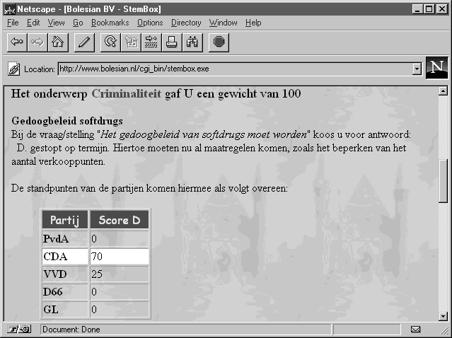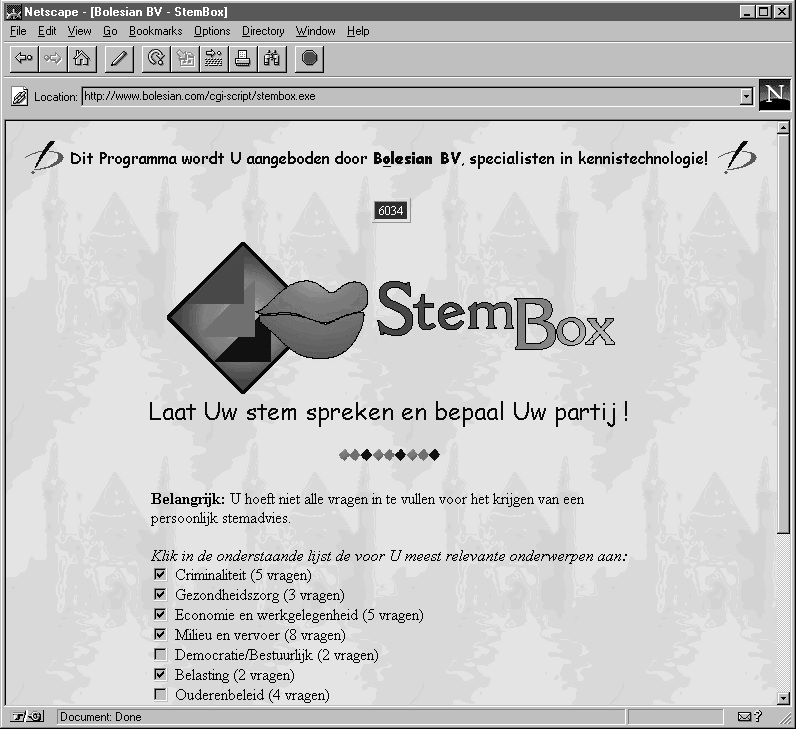 {$APPTYPE CONSOLE} program StemBox; uses DrBobCGI, { ValueAsInteger } StemBoxKennis; { Topics, SubTopics, Standpunten } const Images = 'http://www.eBob42.com/StemBox/'; EXE = 'http://www.eBob42.com/cgi-bin/StemBox.exe'; URL = 'http://www.eBob42.com'; var User,Topic,i: Integer; begin writeln('content-type: text/html'); writeln; writeln('<HTML>'); writeln('<HEAD>'); writeln('<TITLE>Bolesian BV - StemBox</TITLE>'); writeln('</HEAD>'); writeln('<BODY BACKGROUND="',Images,'yellow.gif">') writeln('<CENTER>'); writeln('<TABLE><TR><td>'); writeln('<IMG SRC="',Images,'bologo.gif"></td><td><CENTER>'); writeln('Dit Programma werd U aangeboden door <b>Bolesian BV</b>,'); writeln('specialisten in kennistechnologie!') writeln('</CENTER></td><td><IMG SRC="',Images,'bologo.gif"></td></TR></TABLE>'); writeln('<FORM ACTION="',EXE,'"METHOD=POST>'); User := ValueAsInteger('User'); if User = 0 then User := NewUser; { nog geen "user" ID - dus nieuwe start } writeln('<INPUT TYPE=HIDDEN NAME=User VALUE=',User,'>'); Topic := ValueAsInteger('Topic'); writeln('<TABLE BORDER><TR><td>',User,'</td></TR></TABLE><BR>'); if Topic = 0 then begin writeln('<IMG SRC="',Images,'stembox.gif"WIDTH="448"HEIGHT=152><BR>'); writeln('<FONT SIZE=5>Laat Uw stem spreken en bepaal Uw partij !</FONT>'); writeln('<P>'); writeln('<IMG SRC="',Images,'lijn.gif">'); writeln('<P>'); writeln('<TABLE>'); writeln('<TR><TD WIDTH=480>'); writeln('<b>Belangrijk:</b> U hoeft niet alle vragen in te vullen'); writeln('voor het krijgen van een persoonlijk stemadvies.'); writeln('<P>'); writeln('<I>Klik in de onderstaande lijst de voor U meest relevante'); writeln('onderwerpen aan:</I>'); writeln('<BR>'); for i:=1 to MaxTopic do begin writeln('<INPUT TYPE=CHECKBOX NAME=Topic',i,' VALUE=',i,'> ',Topics[i].Naam); writeln(' (',Topics[i].SubTopics,' vragen) <BR>') end; writeln('<P>'); writeln('<CENTER>'); writeln('<INPUT TYPE=SUBMIT VALUE="Ga naar het eerste onderwerpscherm">'); writeln('</CENTER>'); writeln('</td></TR></TABLE>') end else .... { vertoond de stellingen/standpunten, of geef advies en/of uitleg } writeln('</FORM>'); writeln('<IMG SRC="',Images,'lijn.gif">'); writeln('<FONT SIZE=1>'); writeln('<CENTER>'); writeln('StemBox created by <a href="',URL,'">Bob Swart</a> for Bolesian BV, '); writeln('Helmond, The Netherlands - last updated: 1998/02/14'); writeln('</BODY>'); writeln('</HTML>') end.Als bovenstaande code voor het eerst wordt uitgevoerd zal zowel de waarde van "USER" als "TOPIC" nog 0 zijn, zodat het startscherm wordt vertoond. Dit ziet er in Netscape Navigator overigens als volgt uit: