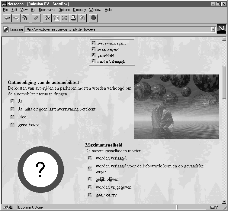 // Topic is het onderwerp waarvan we de Stellingen/Standpunten laten zien for i:=1 to Topics[Topic].SubTopics do begin writeln('<b>',Stelling[Topic,i].Naam,'</b><BR>'); if Stelling[Topic,i].Multi then writeln('<I>(op deze vraag zijn meerdere antwoorden mogelijk)</I><BR>'); writeln(Stelling[Topic,i].Stelling); writeln('<BR>'); writeln('<TABLE WIDTH=400>'); for j:=1 to Stelling[Topic,i].Standpunten do begin write('<TR><td>'); if Stelling[Topic,i].Multi then writeln('<INPUT TYPE=CHECKBOX NAME=',Topic,'-',i,'-',j,' VALUE=',j,'> ') else writeln('<INPUT TYPE=RADIO NAME=',Topic,'-',i,' VALUE=',j,'> '); with Standpunten[Topic,i,j] do writeln('</td><td>',Standpunt,Extra,'</td></TR>') end {Standpunten}; if not Stelling[Topic,i].Multi then { extra antwoord "geen keuze" } writeln('<TR><td><INPUT TYPE=RADIO NAME=',Topic,'-',i,' VALUE=',0,'></td>', <td><I>geen keuze</I></td></TR>'); writeln('</TABLE>'); writeln('<BR>') end;Het resultaat van deze code is - voor het onderwerp Milieu en Vervoer bijvoorbeeld - te zien in de onderstaande screenshot. Merk op dat er "in het echt" ook plaatjes naast de tekst staan, ontworpen door onze grafisch ontwerpster Astrid van Wijngaarden, om de onderwerpen en stellingen te illustreren en het geheel een wat fleuriger aangezicht te geven:
