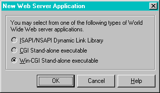Direkt bij het opstarten van de "Web Server Application" Wizard moeten we specificeren wat voor soort Web Server toepassing we denken te gaan ontwikkelen. De keuze bestaat uit CGI, WinCGI en ISAPI/NSAPI (de Microsoft Internet Server resp. Netscape Server APIs). Voor CGI en WinCGI geldt dat het resultaat een executable is, die kwa performance sterk achterblijft bij een ISAPI/NSAPI DLL oplossing. De laatste zal namelijk slechts éénmaal geladen hoeven worden, om vervolgens in het geheugen van de Web Server beschikbaar te blijven. Het nadeel van ISAPI/NSAPI DLLs is dat ze zelfs binnen dezelfde "Memory Space" van de Web Server draaien, zodat een crash of run-time error binnen de ISAPI/NSAPI DLL er helaas ook voor zorgt dat de aanroepende toepassing (de Web Server) ook uit de lucht gaat. Goed testen dus voordat je een ISAPI/NSAPI DLL daadwerkelijk neerzet. En dat is het tweede nadeel: voor het vervangen van de ISAPI/NSAPI DLL zal de Web Server vaak eveneens (met de hand) uit de lucht gebracht moeten worden.