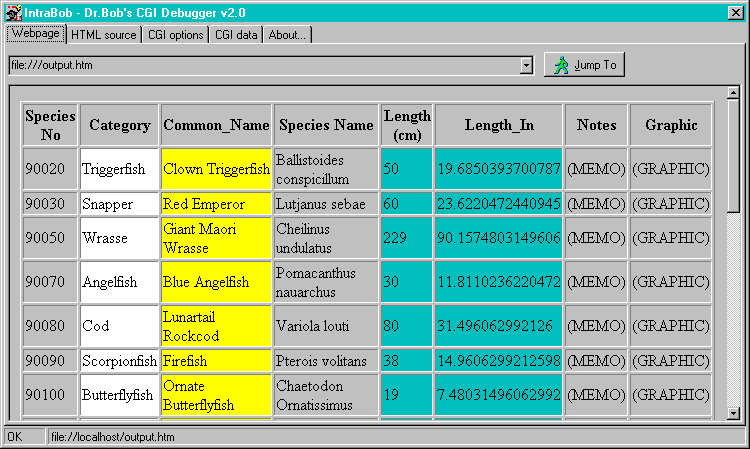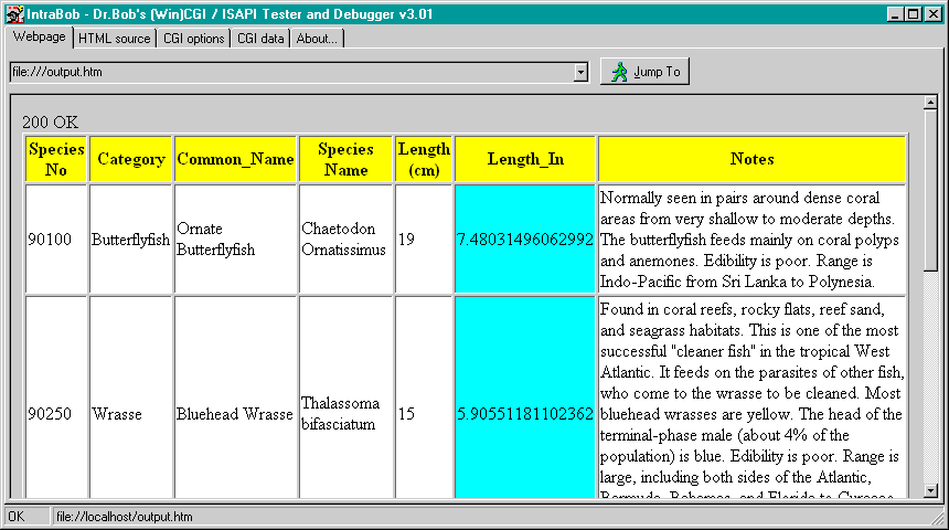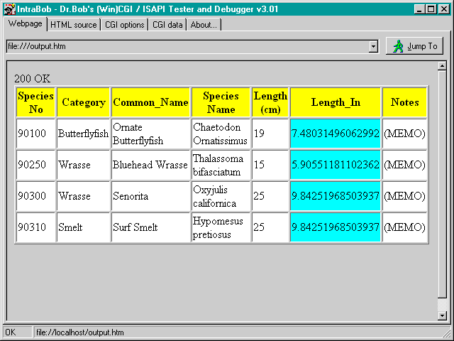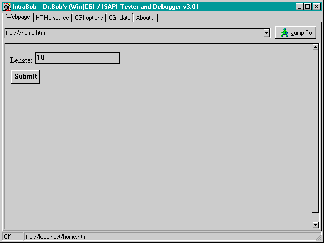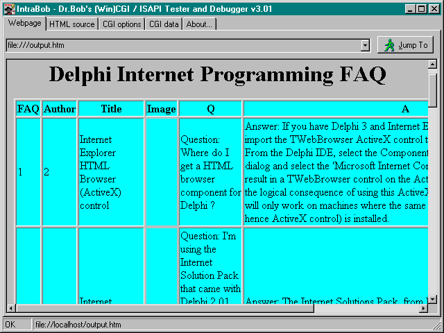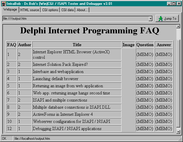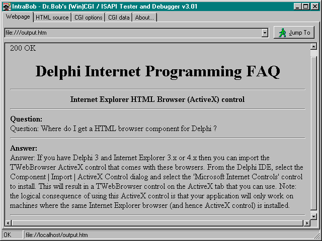 Als vuistregel adviseer ik altijd om te beginnen met een CGI (of WinCGI) toepassing, en die dan later - als alle tests en aanpassingen zijn gedaan - om te zetten naar ISAPI/NSAPI voor optimale performance. Aan het eind van dit artikel zullen we zien dat het omzetten van een Web Modules toepassing van CGI of WinCGI naar ISAPI/NSAPI een fluitje van een cent is, en bestaat uit het aanpassen van twee of drie regels source code! Bovendien kunnen we de "IntraBob CGI Tester v2.5" (te vinden op mijn website) gebruiken om CGI en WinCGI toepassingen te testen zonder ze te hoeven uploaden naar een Web Server. Scheelt weer test en ontwikkeltijd. De keuze voor WinCGI betekent bovendien dat de verzonden data (van het CGI Formulier naar de Web Server) ook nog eens in een .INI bestand bewaard wordt, wat het vinden van fouten extra ondersteunt.