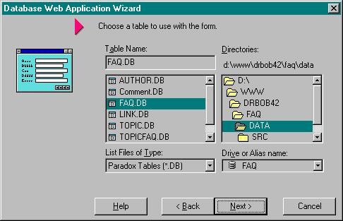 Het maakt overigens niet uit of we voor een TTable of een TQuery kiezen; in beide gevallen wordt er van een TDataSetTableProducer gebruik gemaakt die met een TDataSet wil praten (de "parent" class van zowel een TTable en een TQuery). Ik beide gevallen kunnen we in de tweede pagina van de Wizard de Database Alias aangeven en de Tabel kiezen die we willen zien: