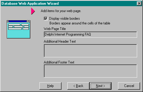 In de voorlaatste pagina van de Database Web Application Wizard kunnen we aangeven of we zichtbare "borders" willen gebruiken in de tabel. Deze informatie zal gebruikt worden door de TDataSetTableProducer (maar merk op dat we al zagen dat we veel meer kunnen instellen in de Columns property editor van deze control (zoals de achtergrondkleur, de dikte van de "borders", alignment, etc).