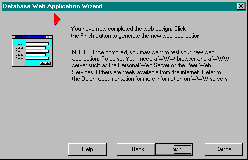 De laatste pagina van de Database Web Application Wizard bevat een mededeling betreffende het testen van de Web Module toepassing, waar een Web browser en server voor nodig is. Dit is echter niet helemaal waar, zoals we straks zullen zien, want een kopie van IntraBob is genoeg, en biedt minstens zoveel test en debug gemak:
