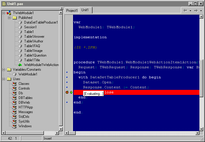 Als we op de Finish-knop drukken krijgen we een nieuw Delphi ISAPI/NSAPI (library) project, dat uit een Web Module bestaat, met daarop een Session, een Query en een DataSetTableProducer. De Web Module bevat één enkele aktie met als PathInfo "ShowTable", en de event code voor deze aktie is tevens de enige code die verder de moeite van het vermelden waard is: