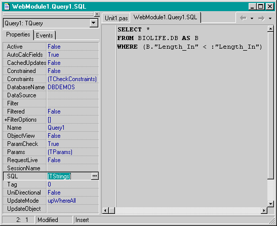 Zet de DatabaseName van de Query op DBDEMOS, en schrijf de volgende SQL query in de SQL property. Als we op de elipsis (de drie puntjes) naast de SQL property klikken in de Object Inspector, dan krijgen we een dialoogje waarin we de SQL code kunnen schrijven. Deze dialoog heeft echter ook een "Code Editor" button, waarmee we de SQL query vanuit de Code Editor zelf kunnen schrijven (inclusief syntax highlighting dus).