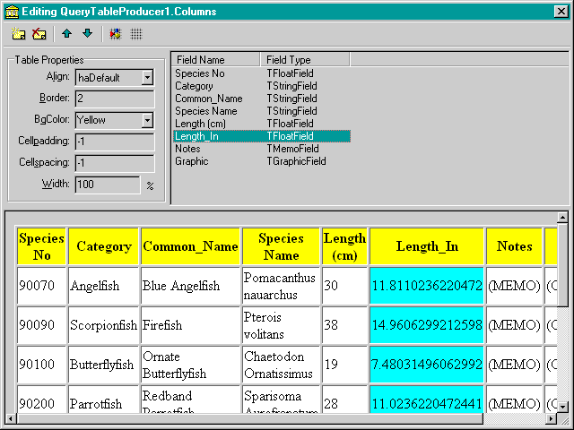 Let op dat we het code window voor de WebModule1.Query1.SQL wel moeten sluiten om de waarde in de SQL property zelf te updaten. Vervolgens moeten we de Params property editor starten, en de "Length_In" property als DataType ftInteger, en als ParamType ftInput geven. We kunnen hier zelfs al een Value invullen (zoals 17 - inches) die als default waarde voor deze Parameter gebruikt kan worden. We kunnen tot slot controleren of de SQL code en de Parameter definitie geen fouten bevat door de Active property van de Query op True te zetten. Als dit lukt zonder problem, dan is het goed. Laat Active op True staan, en koppel nu de Query component aan de QueryTableProducer component door de Query property van de QueryTableProducer naar Query1 te laten wijzen, en klik hierna op de Columns property editor van de QueryTableProducer. Met de Columns Editor die we nu te zien krijgen kunnen we - tijdens design-time - aangeven welke velden en op welke manier we willen zien als output: