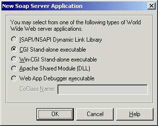 De keuzemogelijkheden zijn ISAPI/NSAPI, standaard CGI, WinCGI, Apache (nieuw in Delphi 6) of een Web App Debugger toepassing.