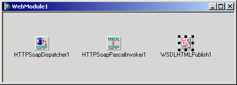 Zodra je in de Soap Server Application Wizard op OK klikt krijg je een normale web module, maar met drie speciale componenten: een HTTPSoapDispatcher, een HTTPSoapPascalInvoker en een WSDLHTMLPublish component.