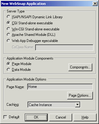 Deze dialoog lijkt erg op die van de nieuwe WebSnap Application, maar heeft geen speciale Component en Page Options knoppen meer.