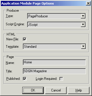 Default staan alleen de eerste, derde en vierde checkbox aan; de rest uit. De tweede knop op de WebSnap Aplication Wizard dialoog kan gebruikt worden om de Page Options op te geven. Hierin kunnen we aangeven wat voor soort PageProducer gebruikt moet worden (voorlopig de keuze uit de PageProducer, DataSetPageproducer, AdapterPageProducer, INetXPageProducer of de XSLPageProducer). Ook kan je hier de script-engine kiezen (default op JScript) en aangeven wat voor soort template gemaakt moet worden. Het enige dat ik echter invul is de naam van de pagina (Home) en de titel (SDGN Magazine).