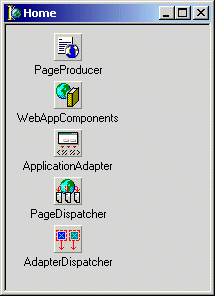 De PageProducer, de WebAppComponents (met properties die wijzen naar de rest), en de drie componenten die we in de Web App Components dialoog hadden geselecteerd.