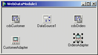 We moeten nu nog een ding doen, en dat betreft het plaatsen van twee Adapter componenten (beide een DataSetAdapter in dit geval - het derde component van de WebSnap tab) om de velden uit zowel de Customer als de Orders dataset beschikbaar te maken (als AdapterFields) voor de rest van de WebSnap toepassing.