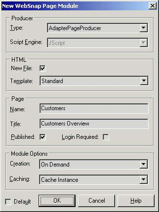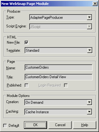 Gebruik weer dezelfde wizard uit de WebSnap tab van de Object Repository, en kies wederom voor een AdapterPageProducer.