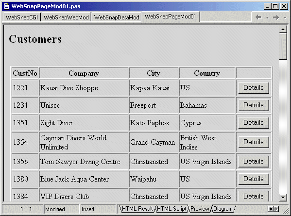 Wie in de tussentijd een blik op de Code Editor heeft geworpen zal het niet ontgaan zijn dat er in plaats van een Code tab (en een Diagram tab die ook nieuw is in Delphi 6) er een aantal extra tabs te zien zijn, zoals WebPageMod01.pas, WebPageMod01.html, HTML Result, HTML Script en Preview.