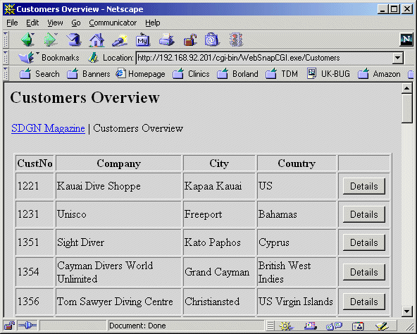 De eerste pagina is nog niet zo spannend (alleen maar SDGN Magazine als titel en twee links: naar Customers Overview en Customer Orders Detail View), maar de tweede pagina geeft een mooie Customers Overview: