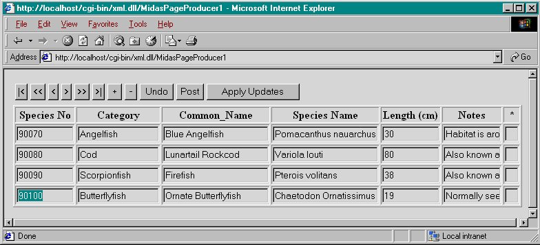 Als we tenslotte ervoor zorgen dat de Web Module applicatie ook in onze cgi-bin directory komt te staan (of in ieder geval een directory met execution rights) en dat de "default internet user" permissie heeft om de MIDAS middle-ware applicatie op te starten (vanuit onze Web Module), dan kunnen we het resultaat bekijken in bijvoorbeeld Internet Explorer 4 of hoger, of Netscape Communicator 4 of hoger: