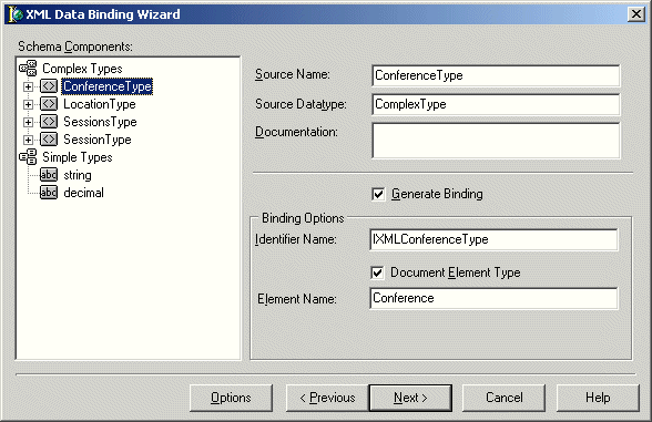 De meest direkte vorm van ondersteuning kunnen we vinden door te dubbelklikken op de XMLComponent zelf, waardoor de XML Data Binding Wizard wordt gestart.