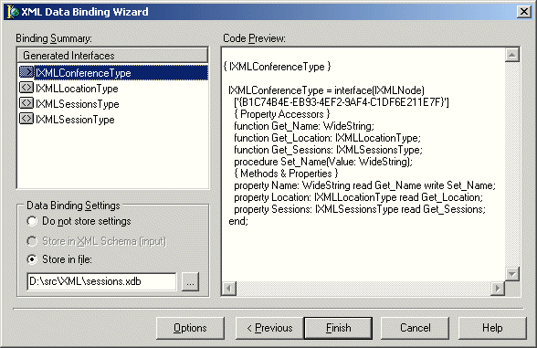 Het resultaat van de Delphi XML Data Binding Wizard is een unit die zowel de interface definities als de class implementaties bevat die het XML document kunnen benaderen op een gebruikersvriendelijke manier: we kunnen nu van het XML document meteen de Name property vragen, of de Location (met subproperties Date en Place) en de Sessions - een array, waarbij ieder Session element weer de bijbehorende properties heeft. De interface sectie van de gegenereerde unit Sessions.pas ziet er overigens als volgt uit (ik heb de implemenatie weggelaten om niet te veel ruimte te verspillen):