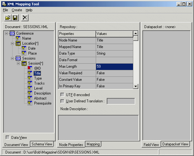 Het middelste deel van de XML Mapper kan overigens ook gebruikt worden om de properties van de verschillende knopen in de XML boom (links in de Document View) aan te passen.
