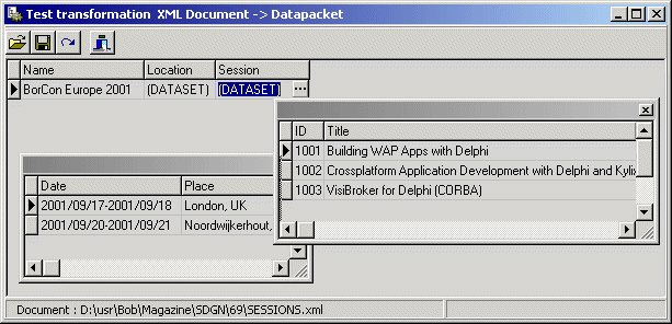 Het SESSIONS.xml document dat ik gebruik beschrijft een drietal sessies die ik voor de Europese Borland Conferentie heb gehouden, die zelf weer op twee locaties is geweest.