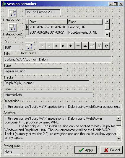 En tenslotte wil ik alle velden van de ClientDataSetSession laten zien in DBEdit controls, met uitzondering van het Abstract veld dat in een DBMemo vertoond moet worden.